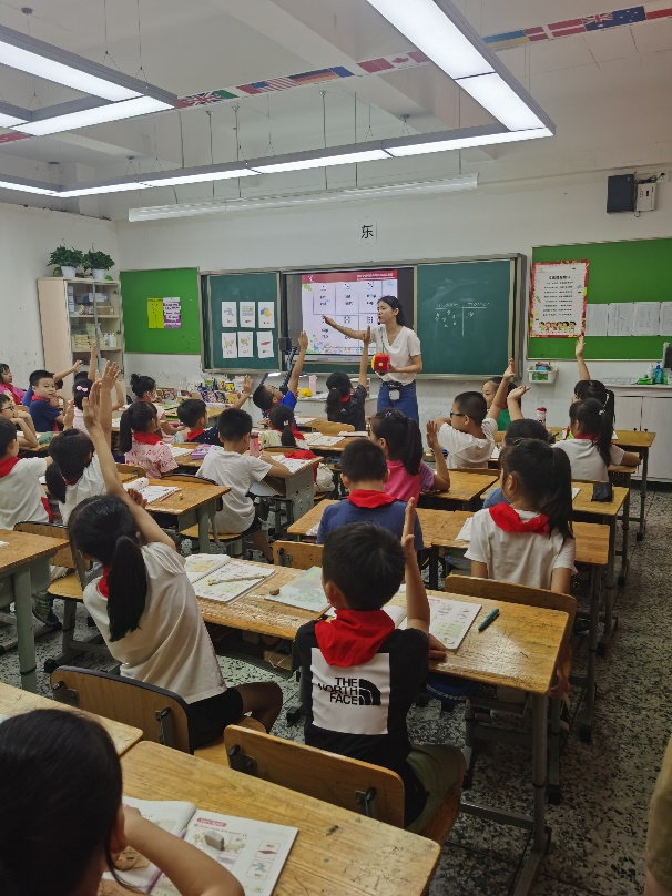 第三节课由李呐老师执教三年级9班,内容为Unit 1的let’s spell。Lina老师通过引导学生读词语去发现字母的发音规律,并通过听、拼读、写等多种练习帮助学生掌握规律。Lina老师纯正的发音为学生做了良好的示范,色子游戏和趣味练习单极大激发了学生的兴趣。