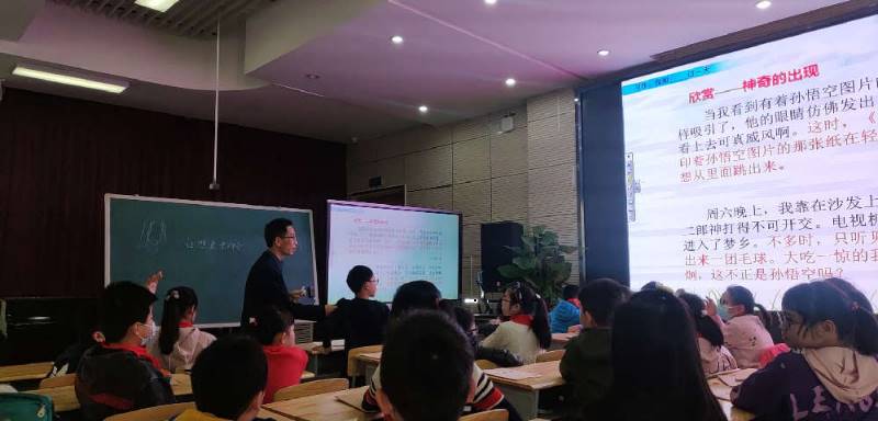 “我连忙定睛一看,只见他头戴紫金冠,身穿黄金甲,脚踏步云履,手拿金箍棒,果然是《西游记》里大名鼎鼎的孙悟空……”在张大建老师的循循善诱下,同学们兴致勃勃地品味着自己的习作,尝试着修改习作“我和——过一天”,力争让“想象更神奇”。