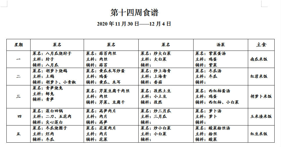 请各位家长查看第十四周午餐菜谱,若您的孩子对某样食材过敏,请一定要提前告知班主任老师哟,谢谢!