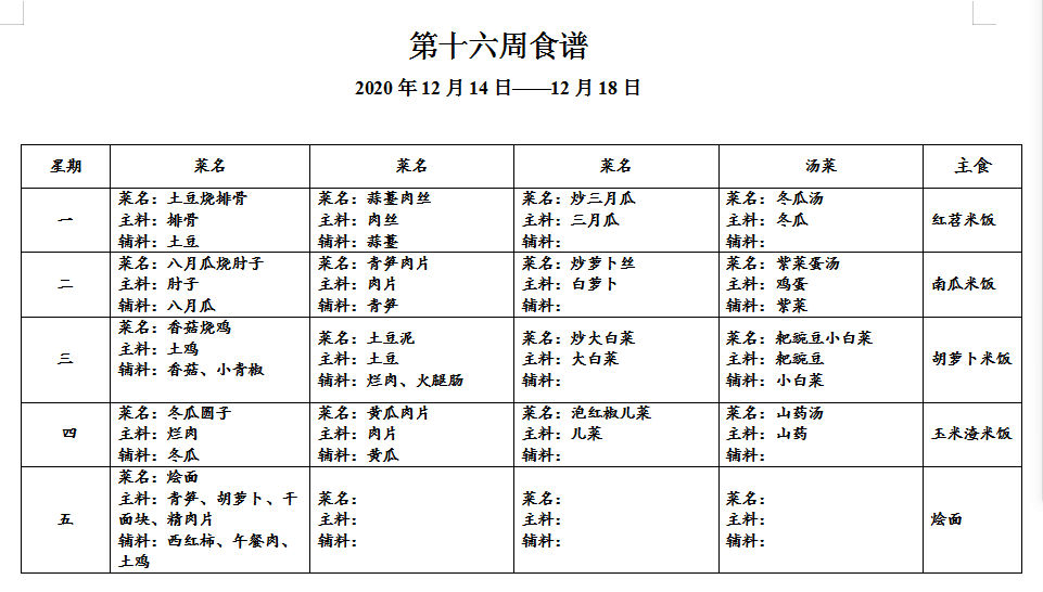 请各位家长查看第十六周午餐菜谱,若您的孩子对某样食材过敏,请一定要提前告知班主任老师哟,谢谢!