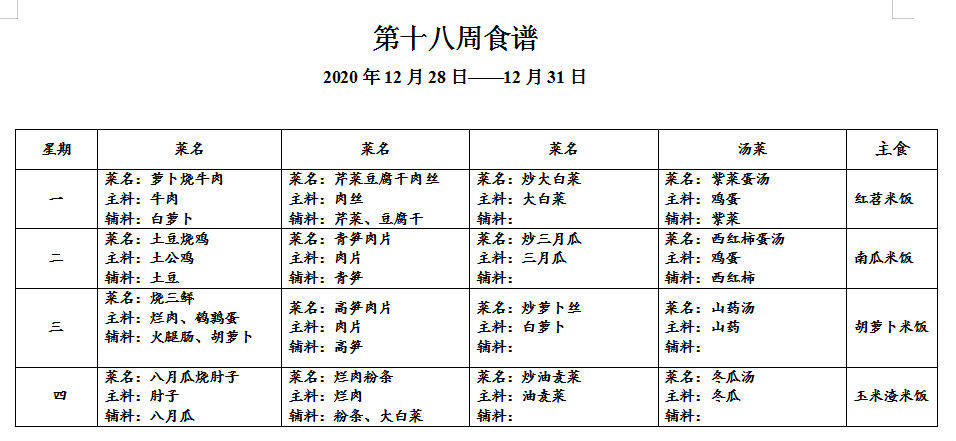 请各位家长查看第十八周午餐菜谱,若您的孩子对某样食材过敏,请一定要提前告知班主任老师哟,谢谢!