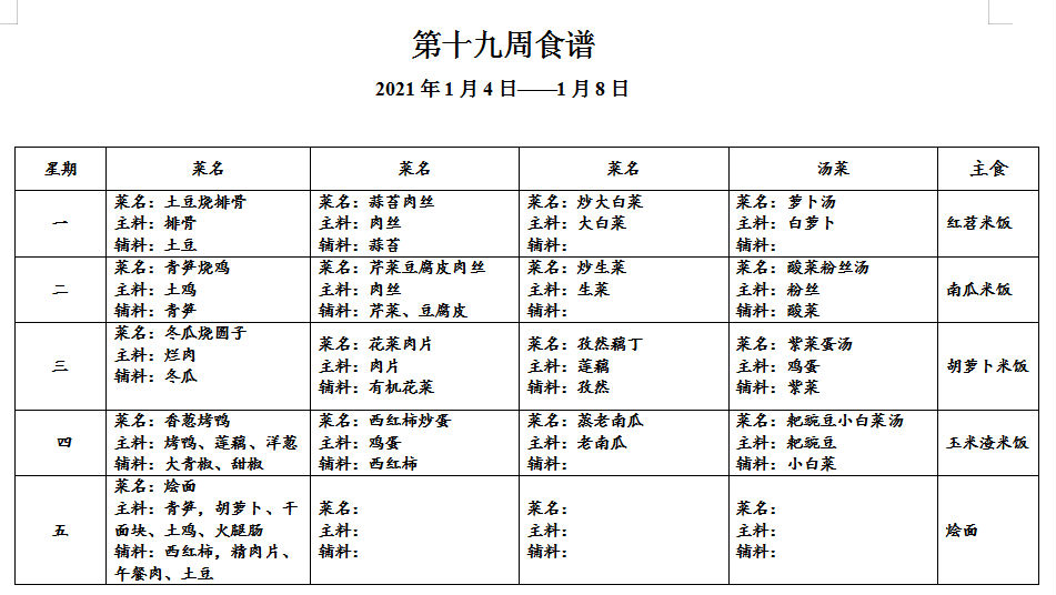 请各位家长查看第十九周午餐菜谱,若您的孩子对某样食材过敏,请一定要提前告知班主任老师哟,谢谢!