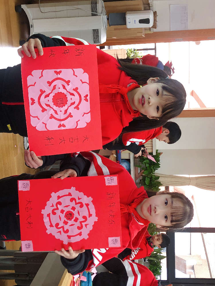 当天中午,孩子们在各班教室分组开展活动。各班孩子分成六组,每组随机抽选一种中国传统年俗工艺品进行现场制作。有制作生肖图的,有剪窗花的,有做旗袍的,有画年画的,有画灯笼的,也有制贺卡的……制作完成后各组逐一介绍展示作品,进行年俗手工艺品知识分享。分享后,通过集体投票,评选出了“最佳人气小组”。