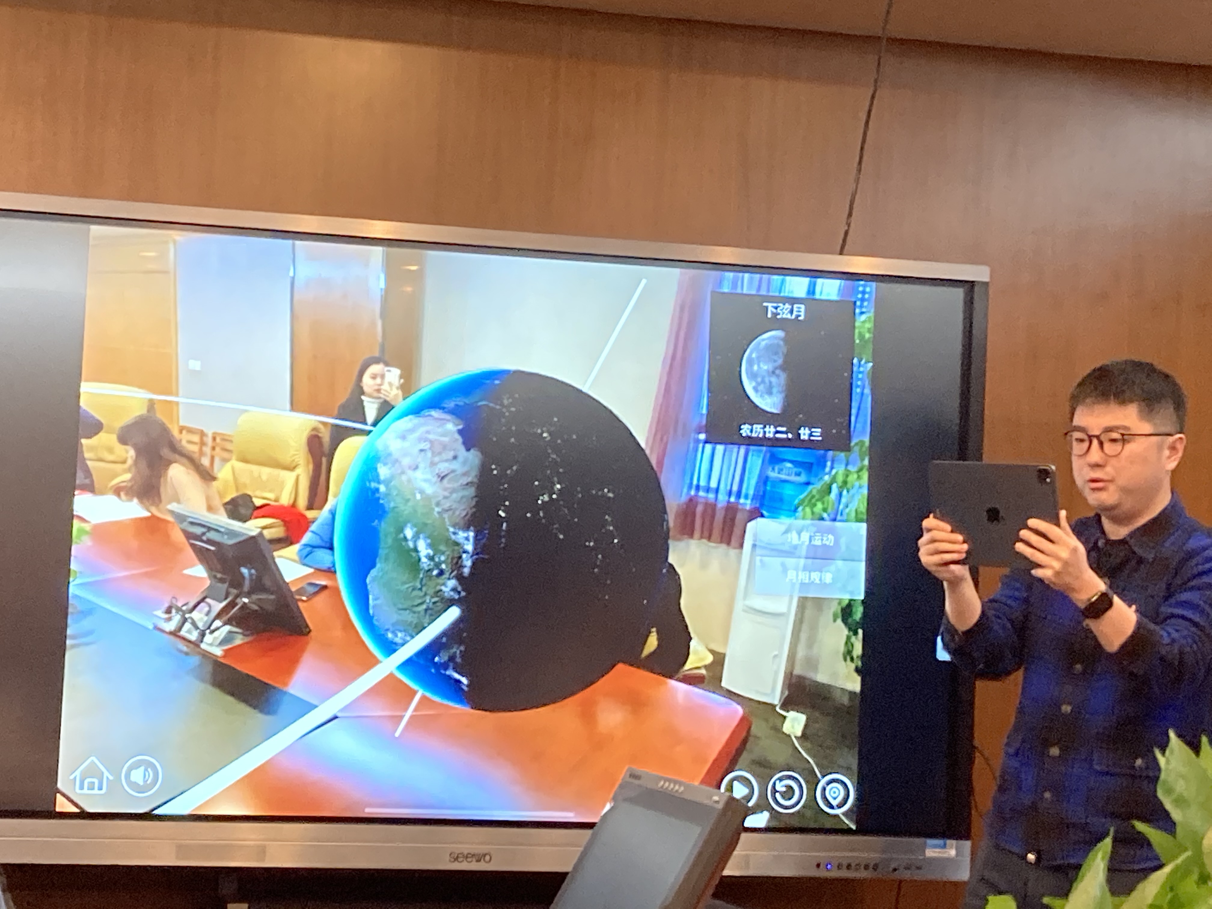 培训工程师然后向老师们展示了丰富多彩、瞬息万变的AR世界。平台同小学科学课程进行结合,通过AR虚拟技术生动、形象、直观地展示了在课堂中难以展示的实物。有欢乐奔跑的小羊、有人体的骨骼展示、有月弦和日食的观景体验,老师们都纷纷沉浸在其中。