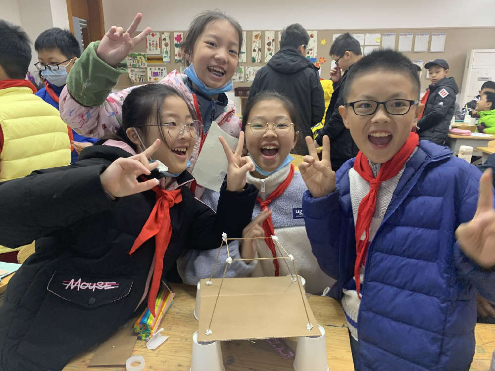 学生在课堂上,遵循工程设计流程,像真正的工程团队一样,经历“问询-调研-计划-创作-测试-改进”的过程,动手搭建最抗震的房屋框架结构,并通过测试改进自己的方案,直到解决问题。从而获得了极大的成就感。