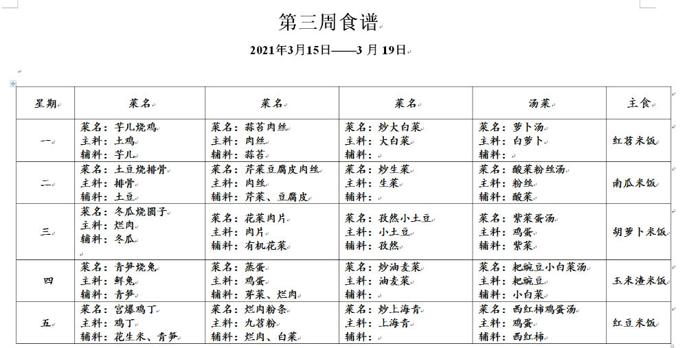 请各位家长查看第三周午餐菜谱,若您的孩子对某样食材过敏,请一定要提前告知班主任老师哟,谢谢!