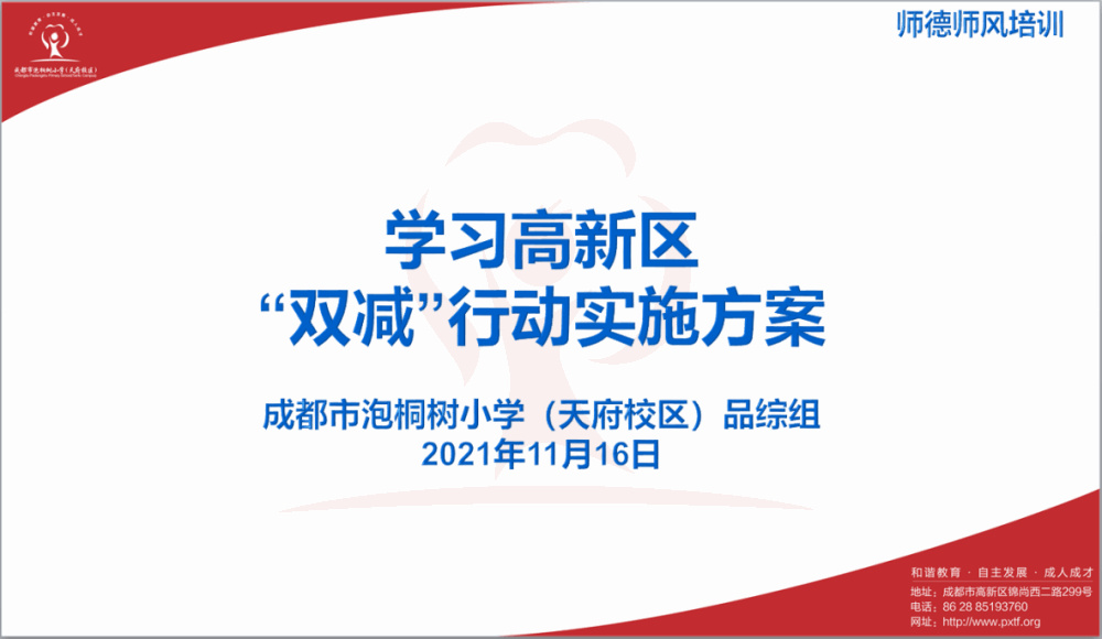 2021年11月16日品综组在曹娟副校长的带领下,进行了11月份师德师风培训——学习高新区“双减”行动实施方案。