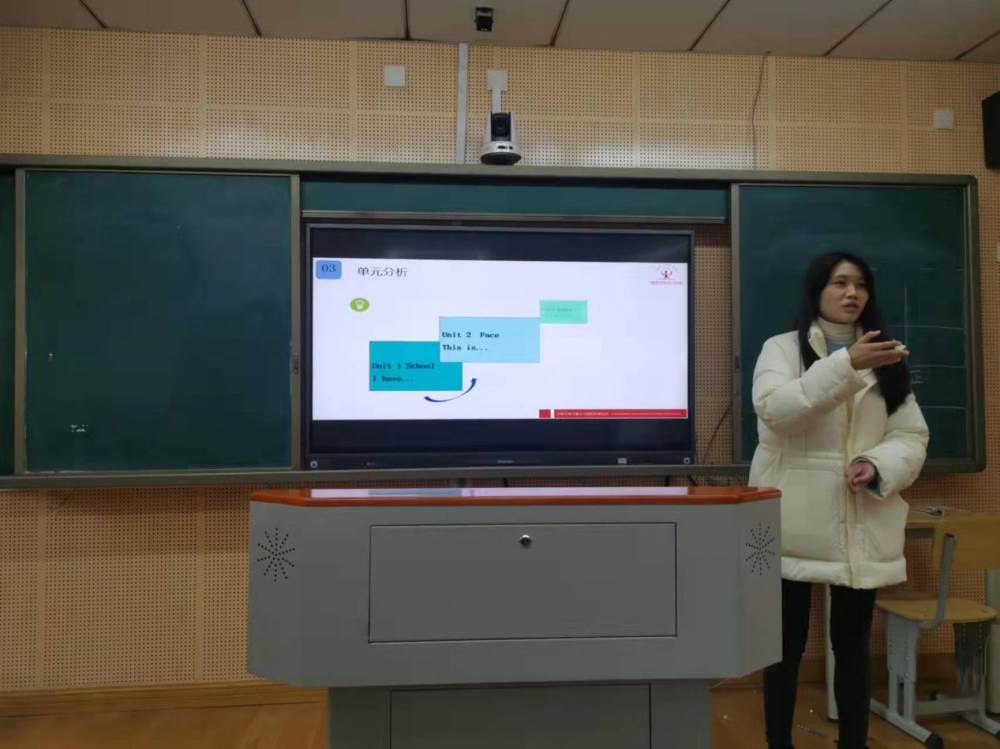 接着“教材解读工作坊”中一年级团队分享了以"聚焦大单元整体教学的对话教学与游戏教学”为主题的教材解读。一年级组的廖颖老师与余祥梦老师以人教版新起点英语一年级上册的三单元为例,从课标、教材体系、单元分析、教学设计亮点等四个方面,为大家进行了展示和解读。在呈现教学设计亮点时,一年级组的老师们以第二课时的情境对话教学为范例,对文本进行了巧用、延申、优化、创设,并与“人与自然”这个大主题进行了有机结合,使英语教学从课本出发,落实到学生的生活。