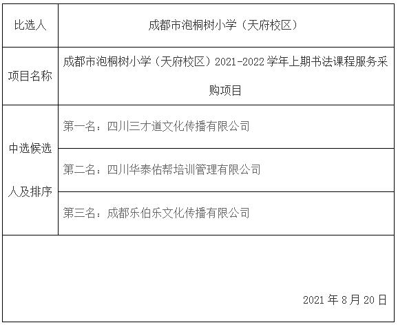 成都市泡桐树小学(天府校区)2021-2022学年上期书法课程服务采购项目 中选侯选人公示