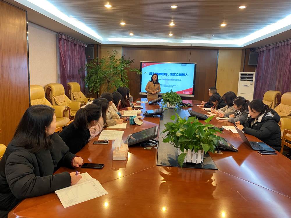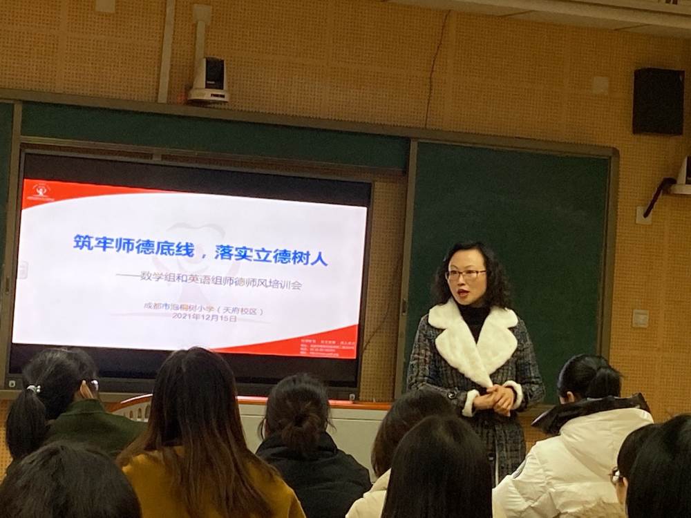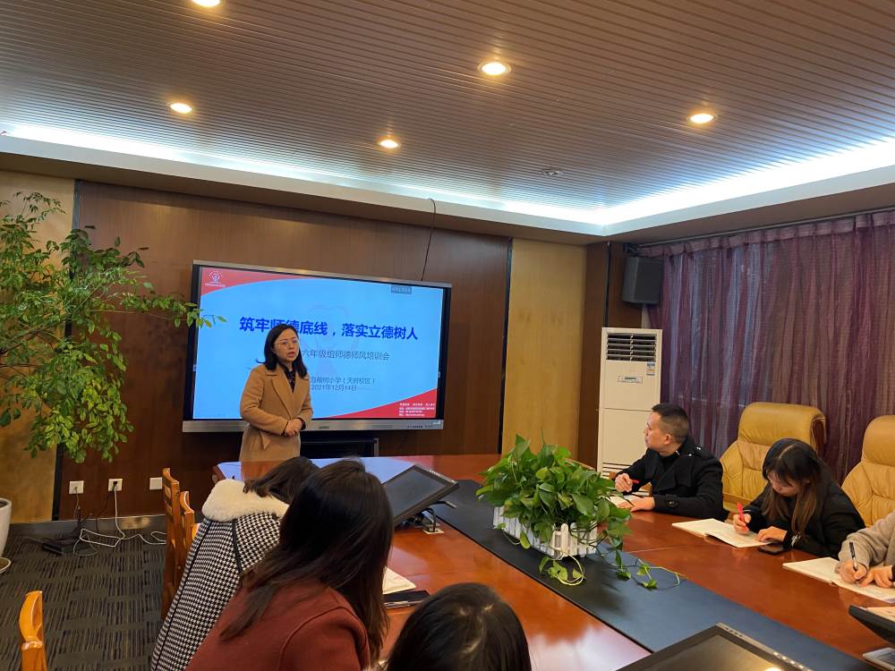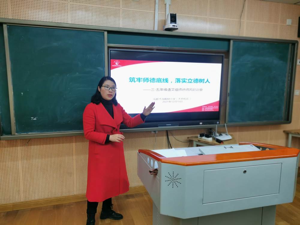 2021年12月14日-16日,学校分学科分年级召开了六场师德师风培训会。主题是《筑牢师德底线,落实立德树人》。会议由教师发展中心欧小丽主任主持,分管教学副校长廖敏主讲,宋茜校长点评。