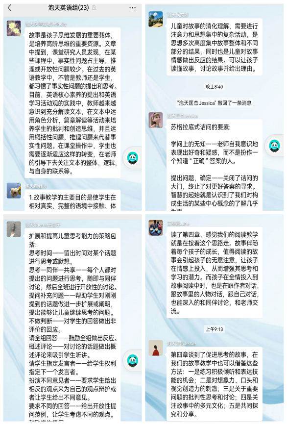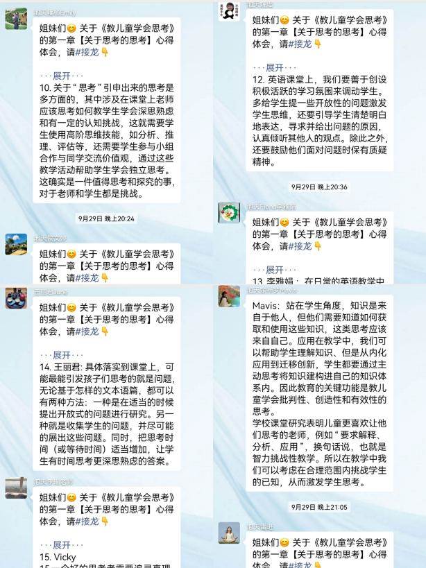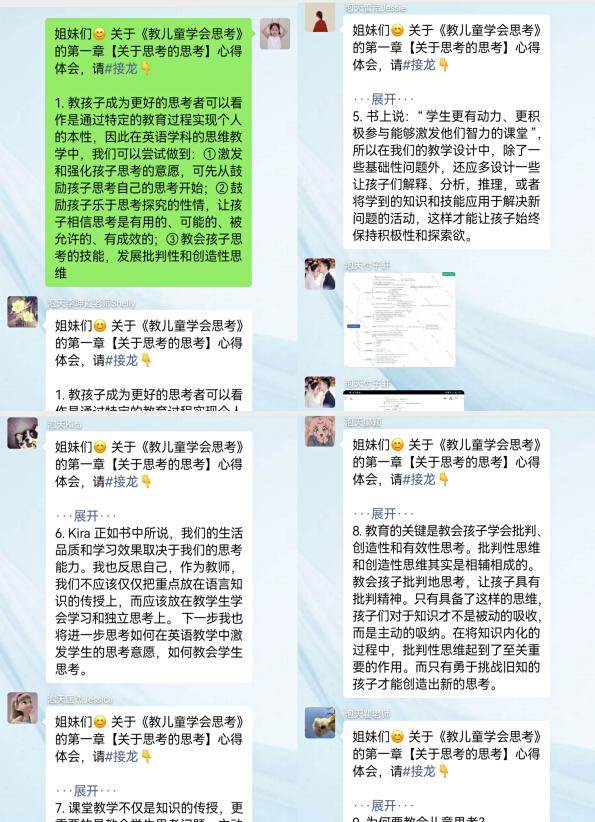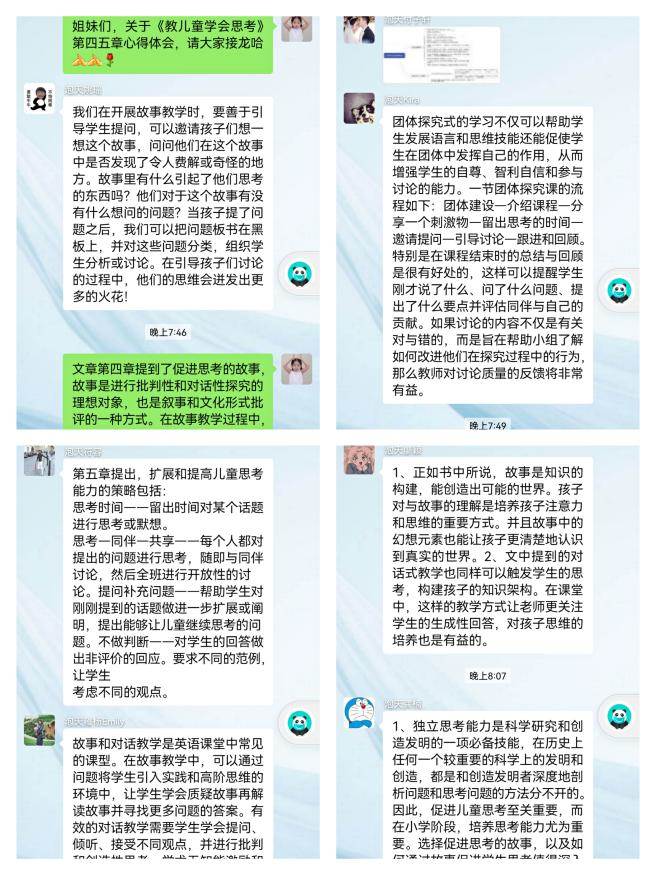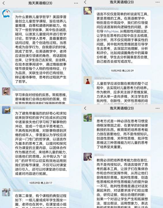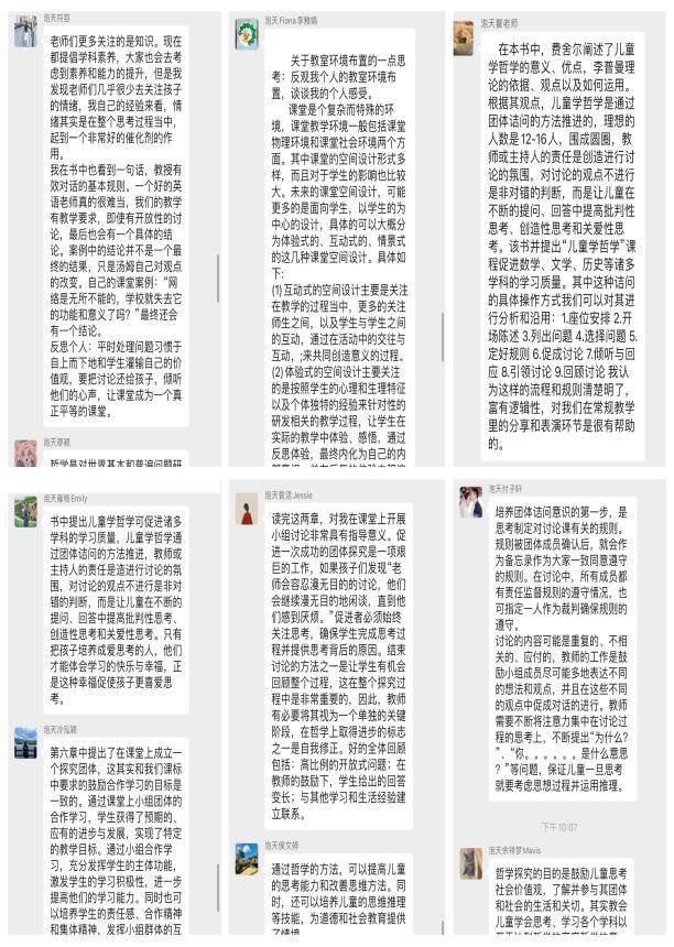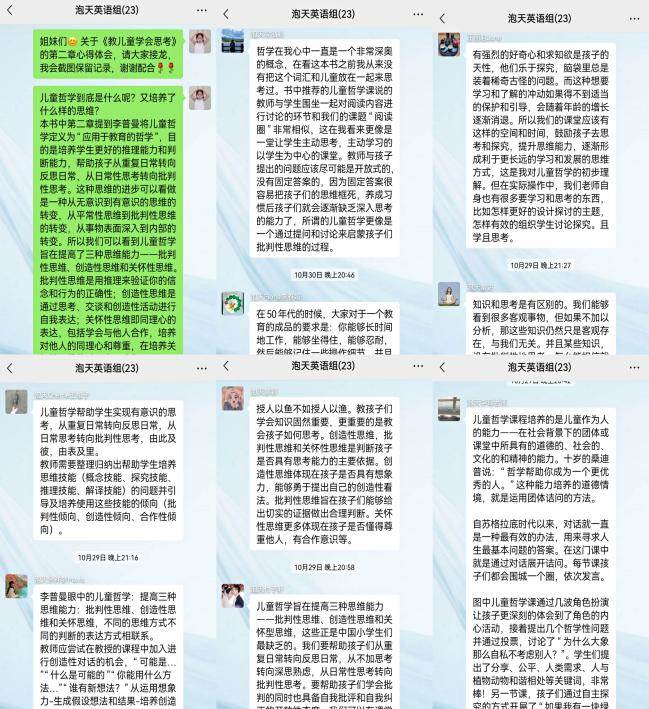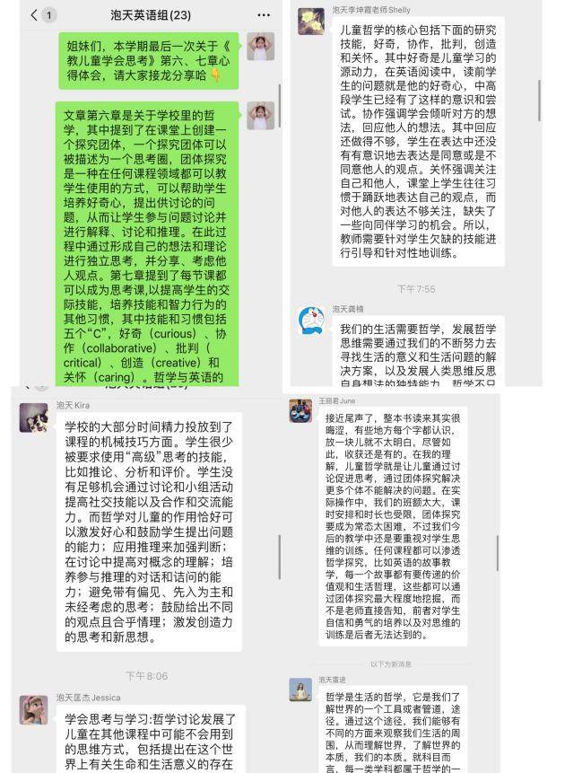 本次活动,英语组教师共读并分享的书籍是《教儿童学会思考》,本书共分为七章,每个月英语组的老师们共同约定好阅读内容以及分享交流时间,一同在微信群内分享自己的读书心得与感悟。