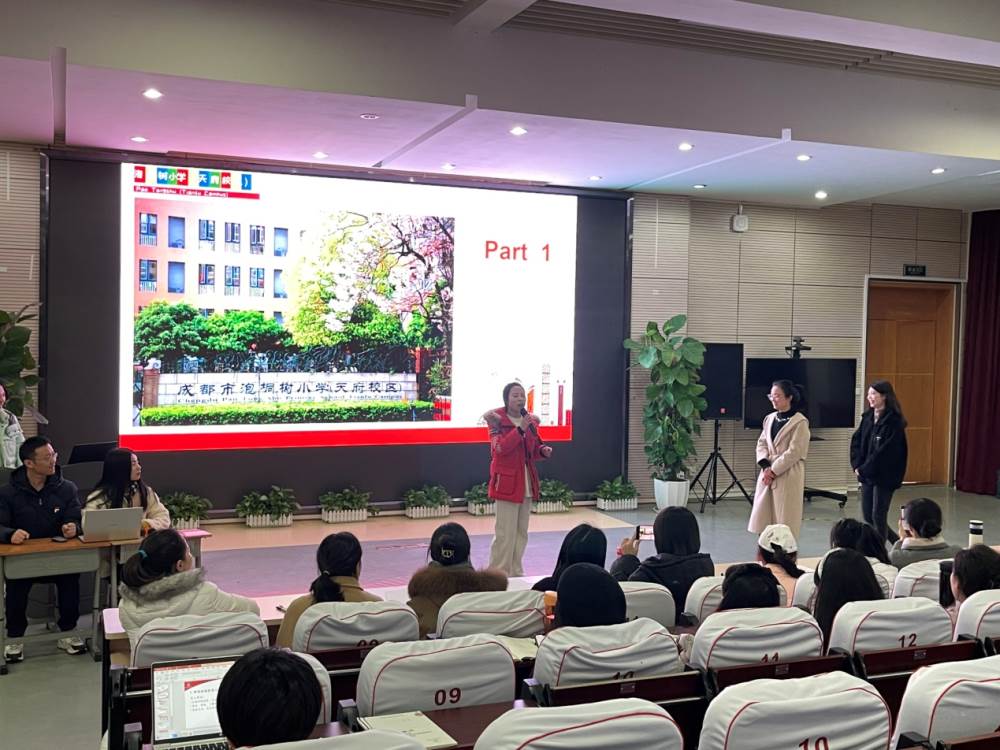 老师们的汇报可谓是精彩纷呈。瞧,第一小组正为我们播报着《泡小新闻联播》!他们将学校“职业体验综合实践活动”的学科融合以新闻播报加表演的形式搬上了舞台,让老师们耳目一新。