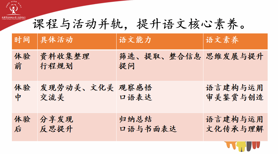 第三小组:坚持课程与活动并轨,提升语文核心素养。将语文训练能力和语文素养合理地分解到体验前、体验中、体验后,让孩子们在活动学习语文,在活动中提升和发展思维,学会语言建构与运用,从而获得审美鉴赏与创造的能力,对文化进行充分理解并传承。