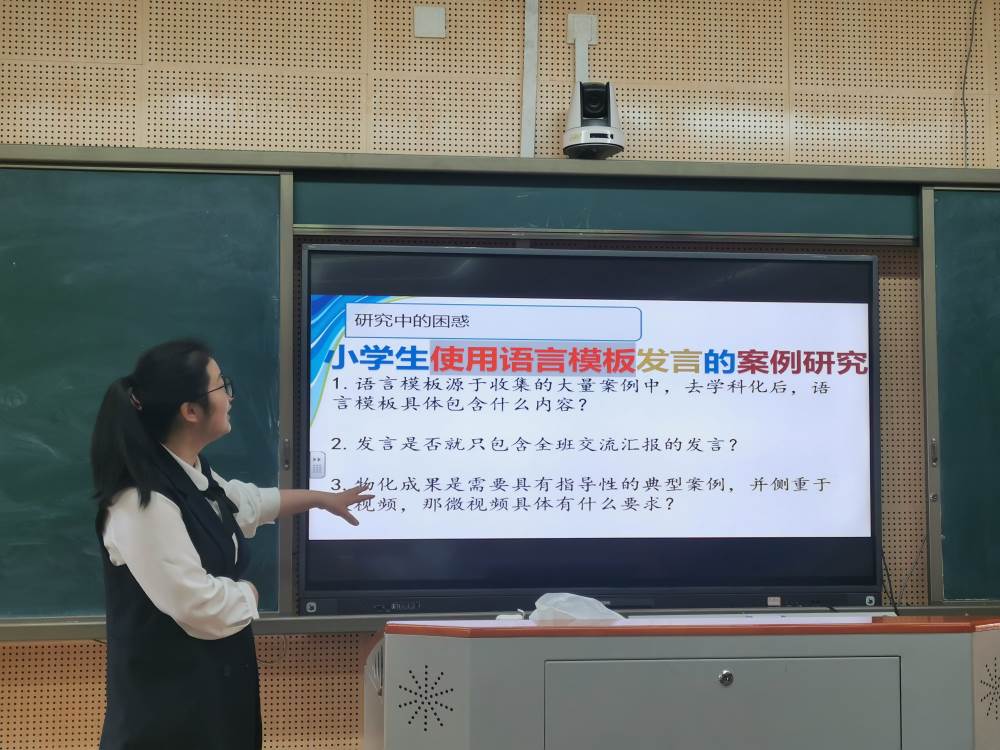 陈晓艳老师提出《小学生使用语言模板发言的案例研究》课题聚焦于形成具有指导性的典型案例集和微视频,让学生养成合作交流、质疑反思的新学习习惯。同时也提出了思考:语言模板是聚焦于数学学科,还是去学科化?发言是否只关注全班交流汇报时的发言?