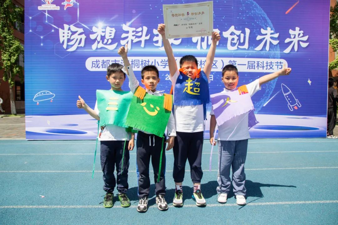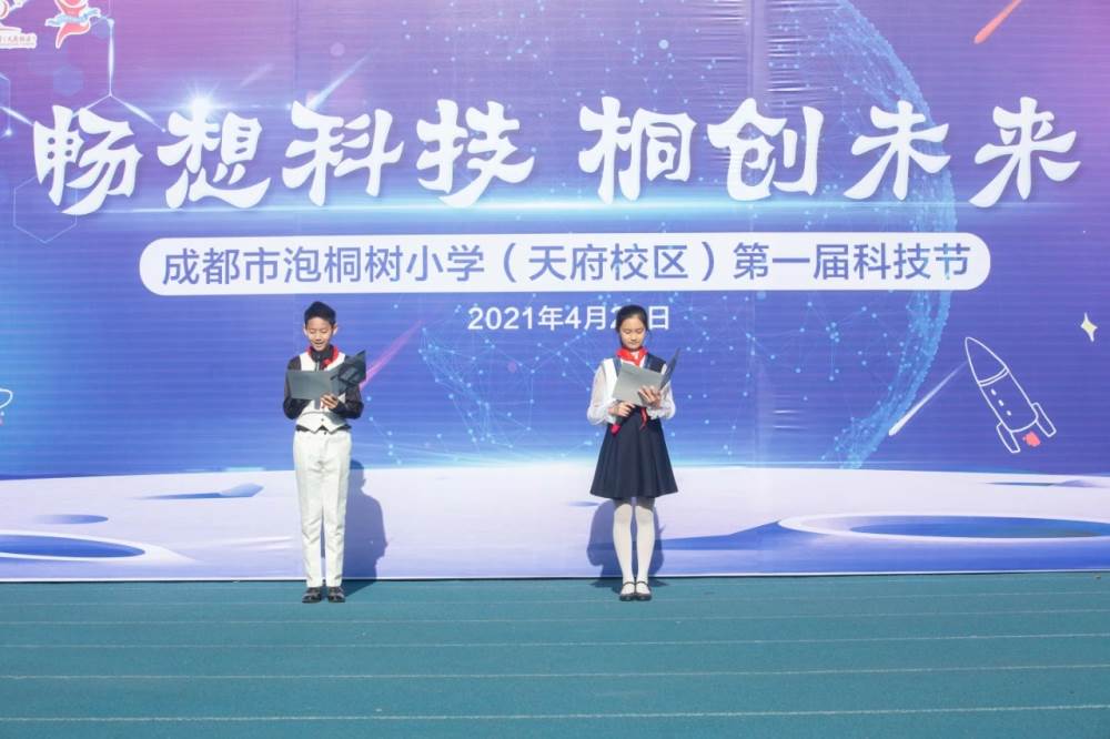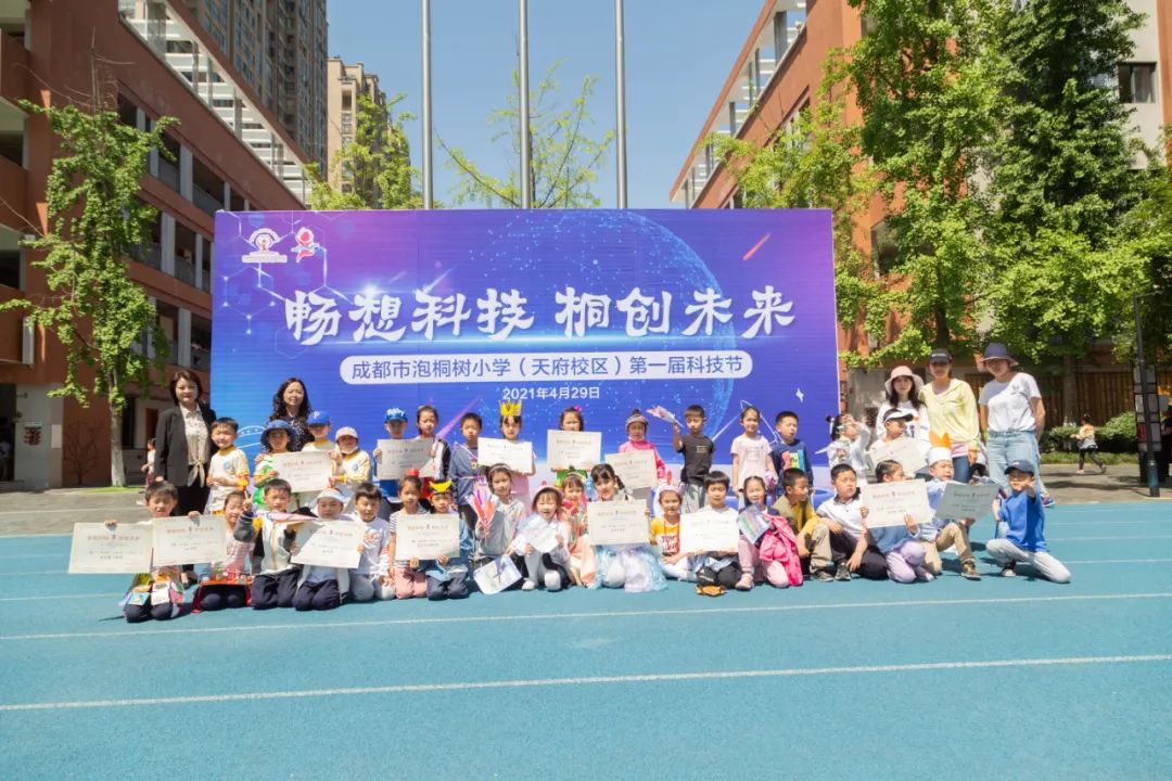 4月是我校首届科技月,本次科技节主题是“畅想科技 桐创未来”。今天,是团体赛决赛和现场展示日, 整整一个月的科技月活动落下帷幕 。今日校园俨然化身为科学的乐园, 等待小泡泡们开启探索之旅, 本次科技节精心设计的LOGO小人, 素材源自学校LOGO中的小泡泡人, 奔跑的小人寓意奔向未来的小泡泡, 它的名字叫Titi (technological innovation)技术创新 、蓝色的飘带取自科技蓝、 红色是学校的主题色、 小泡泡头戴航空帽,也是科技的象征。 琳琅满目的科创作品, 新奇趣味的互动体验, 紧张刺激的现场赛, 一起来回顾科技节的趣味瞬间吧。 全校师生齐唱国歌拉开科技节序幕, 空中飞行表演将气氛推向高潮, 小泡泡们目光紧紧追随空中的优美弧线, 变幻莫测地飞行、翻转, 引来现场阵阵欢呼声、尖叫声 学生代表发言之后,科技节正式开幕!
