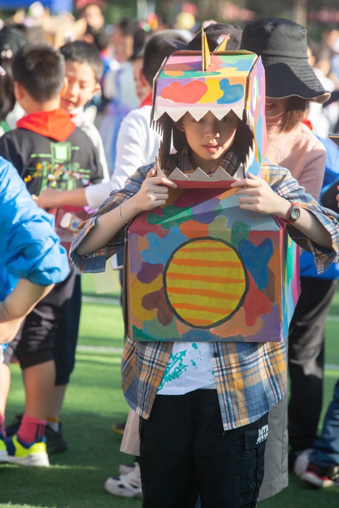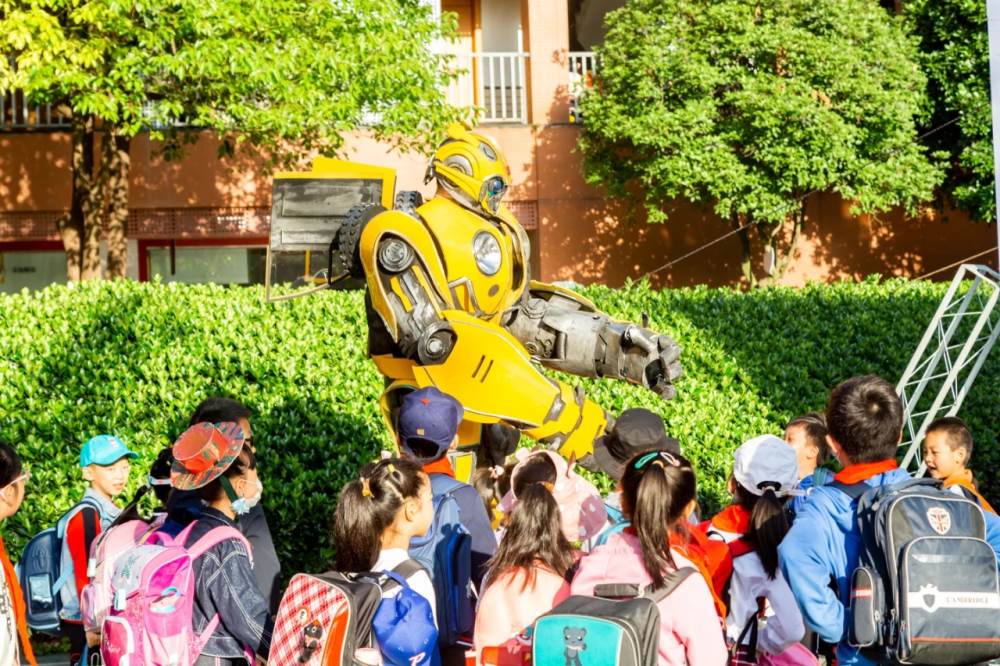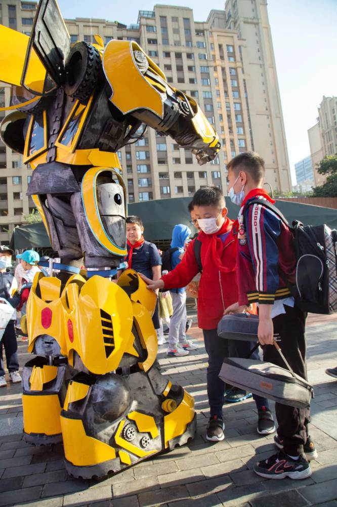 什么是快乐星球?今天的校园给你答案。 高大帅气的“大黄蜂机器人” 一大早就在校门口迎接小泡泡们的到来, 打招呼,握手,围观…… 小泡泡们欢欣雀跃又惊喜若狂 纷纷好奇地与它接触 今天是什么特别的日子呢?