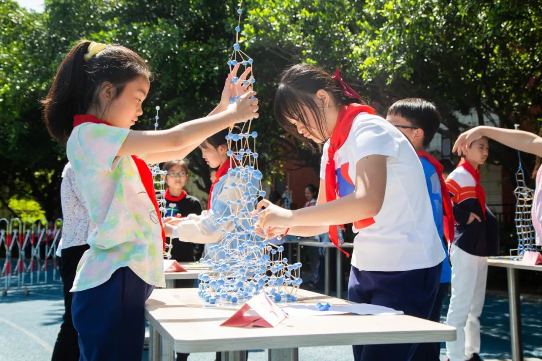 五、六年级现场赛, 需要在有限时间内使用有限材料, 搭建牙签高塔,顶部放置小球, 需要兼顾美观和高度, 还考验团队的配合能力。