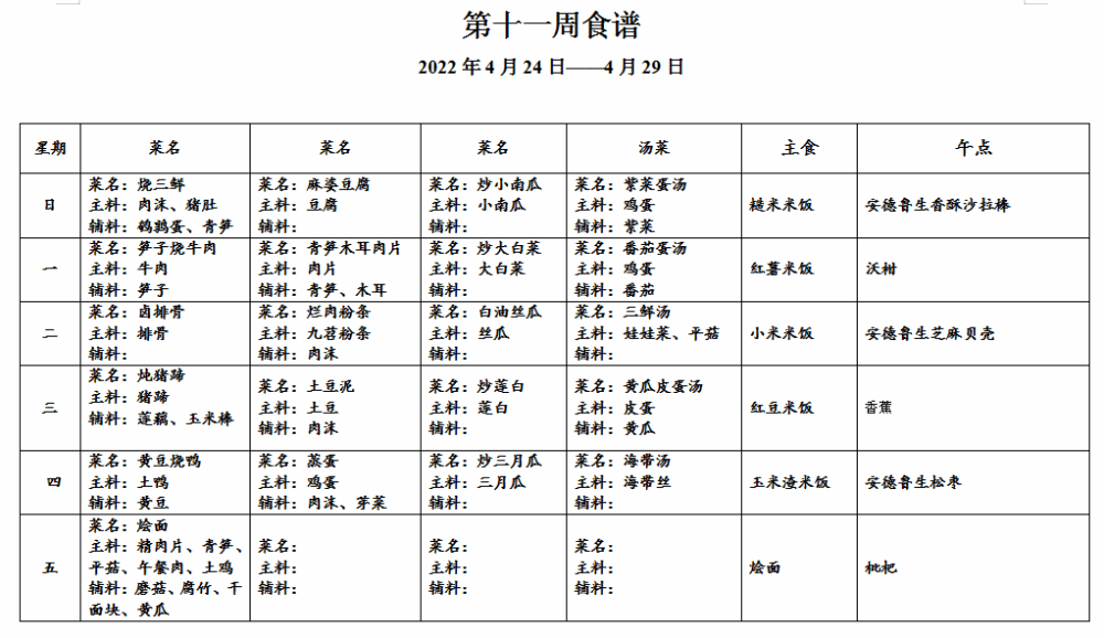 请各位家长查看第十一周午餐菜谱,若您的孩子对某样食材过敏,请一定要提前告知班主任老师哟,谢谢!