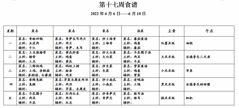 请各位家长查看第十七周午餐菜谱,若您的孩子对某样食材过敏,请一定要提前告知班主任老师哟,谢谢!