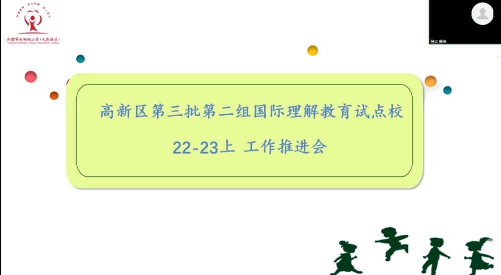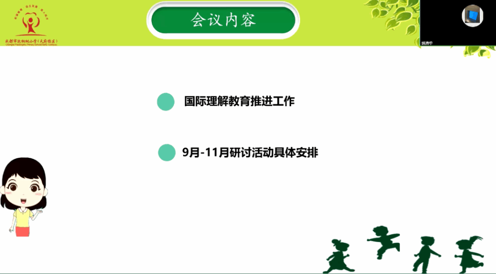 会议由成都市泡桐树小学(天府校区)英语组组长雍杨老师主持,会议内容分为国际理解推进工作、9月-11月研讨活动具体安排两部分。首先,成都市泡桐树小学(天府校区)教师发展中心姚满华主任向骨干老师们阐述了第二组国际理解教育试点校新学年工作方向和推进方案。接着,雍杨老师详细讲解了本学期9月-11月国际理解教育研讨活动具体安排。为了切实帮助各校进行国际理解教育课程建设以及提高老师们的国际理解教育业务水平,研讨活动将举行国际理解教育说课、课例展示、校园国际理解教育课程建设分享等活动,届时将聘请北师大专家高益民教授进行指导点评。最后,老师们就会议内容进行提问、交流。