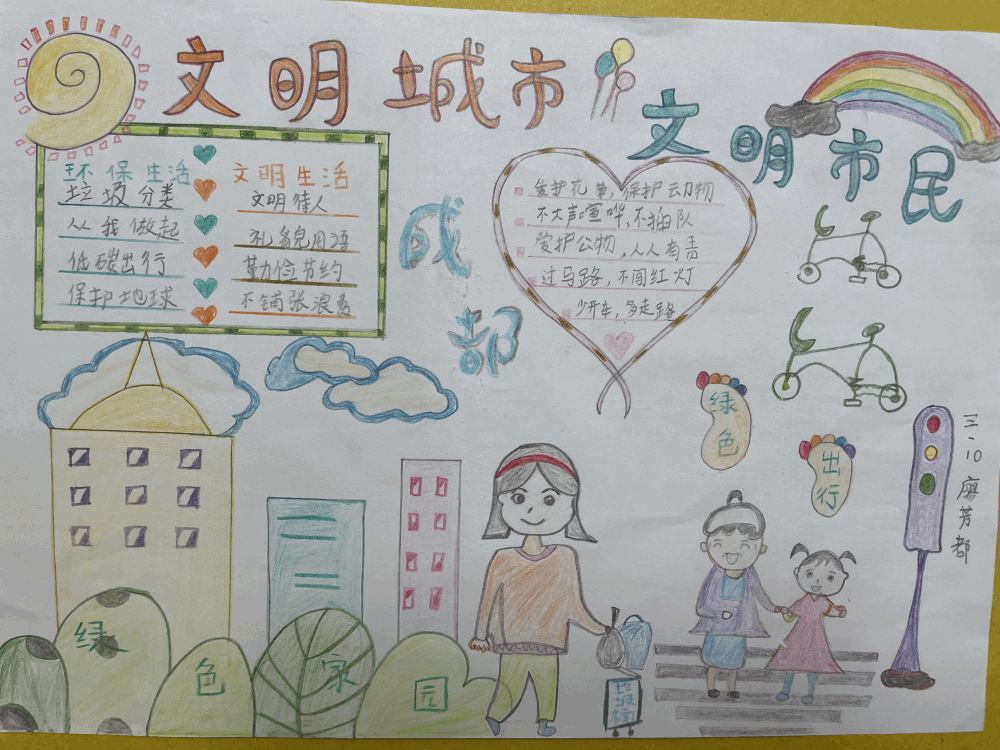 孩子们的作品也丰富多彩,有朗朗上口的儿歌和童谣,有图文并茂的小报,相信文明的种子已经在他们小小的心里生根发芽。