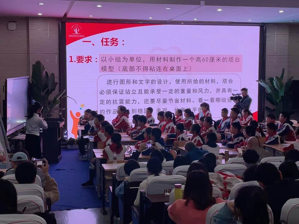 教材单元分析活动完毕,由泡桐树小学(天府校区)科学老师周云露带来《设计塔台模型》课例展示。周老师以为学校设计一座塔台为任务引入本课,带领学生明确工程要求到设计要求的转换,塔台模型的设计方案,充分尊重学生的主体地位,设计图完成后,分享环节精彩纷呈,各小组积极提出补充及改进建议。
