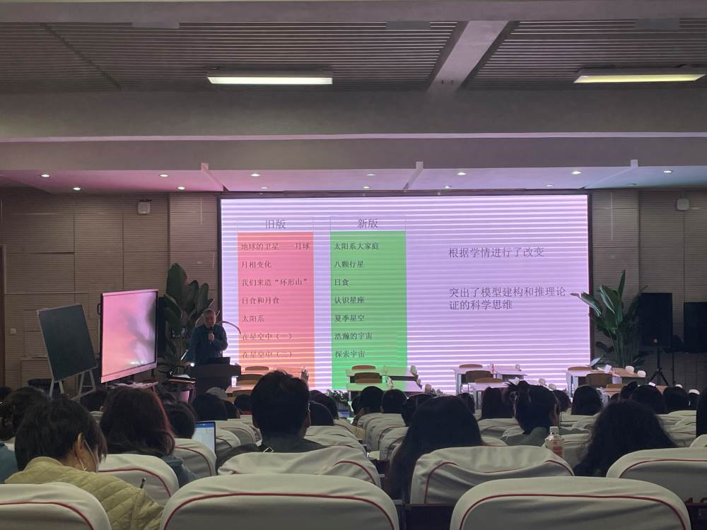 第二位来自银都紫藤的周玉刚老师对“宇宙”单元进行了分析。周老师首先对比了教材旧版与新版的区别,总结了学情、(模型建构、推理论证)科学思维等方面的变动。