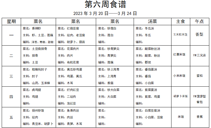 请各位家长查看第六周午餐菜谱,若您的孩子对某样食材过敏,请一定要提前告知班主任老师哟,谢谢!