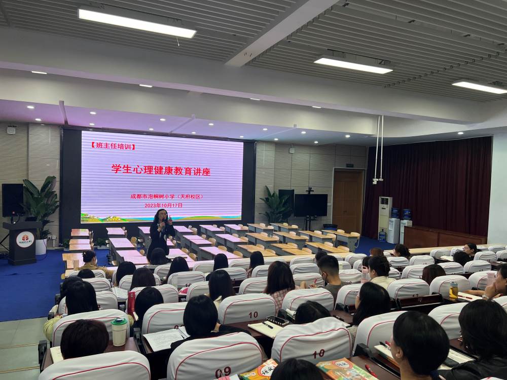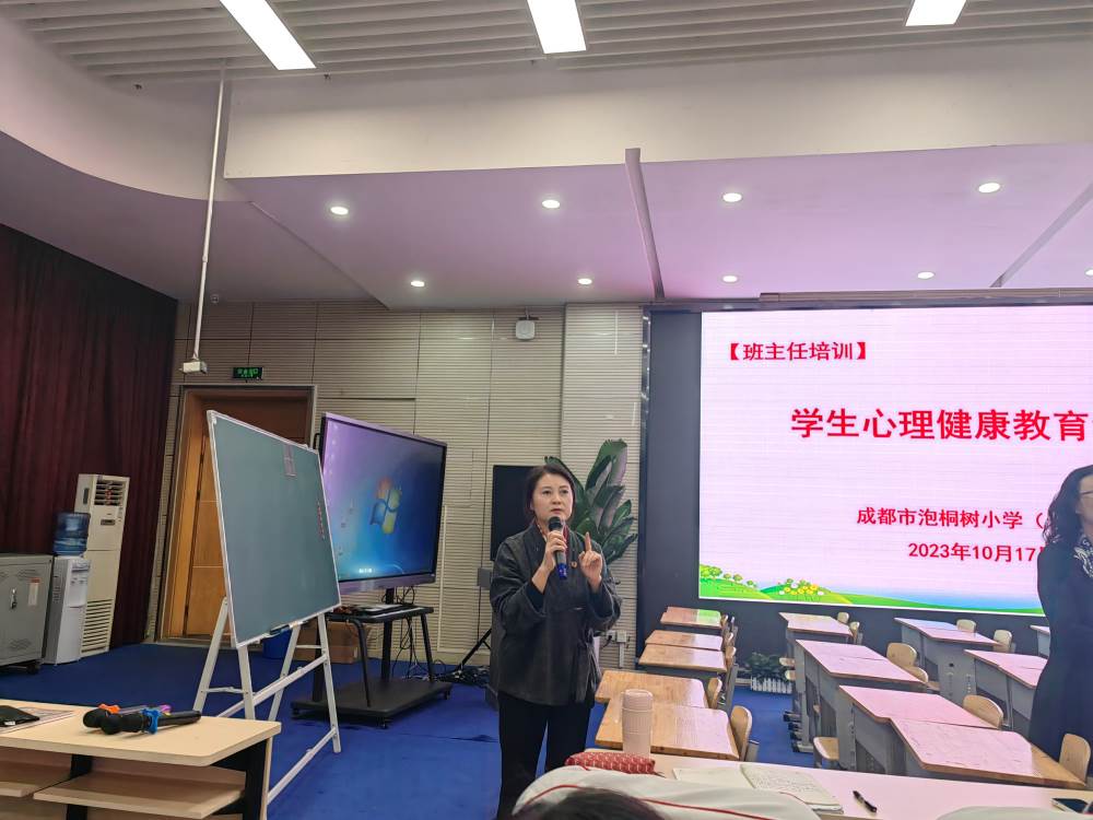 为提高班主任老师对学生心理危机问题的识别与应对能力,深入了解心理健康教育相关知识,做到对学生心理问题早发现、早干预,有效预防学生心理危机事件发生,10月17日,成都市泡桐树小学(天府校区)组织开展了班主任心理健康教育辅导技能培训会,全体班主任老师参与,宋茜校长亲自为班主任老师们带来了学生心理健康教育专题讲座。