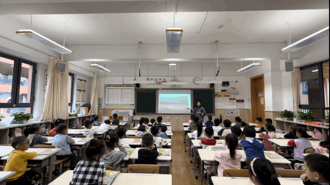 低段课堂上老师们通过朗朗上口的歌谣、歌曲引入主题,帮助孩子们学习词汇及句型;创设贴近生活的场景帮助孩子们内化所学句型;利用全班活动、同桌或小组活动及全班展演的方式实现师生、生生充分交流、互动。在课堂管理方面通过大组比赛的方式强化课堂常规、鼓励积极思考、勇于展示的课堂氛围。