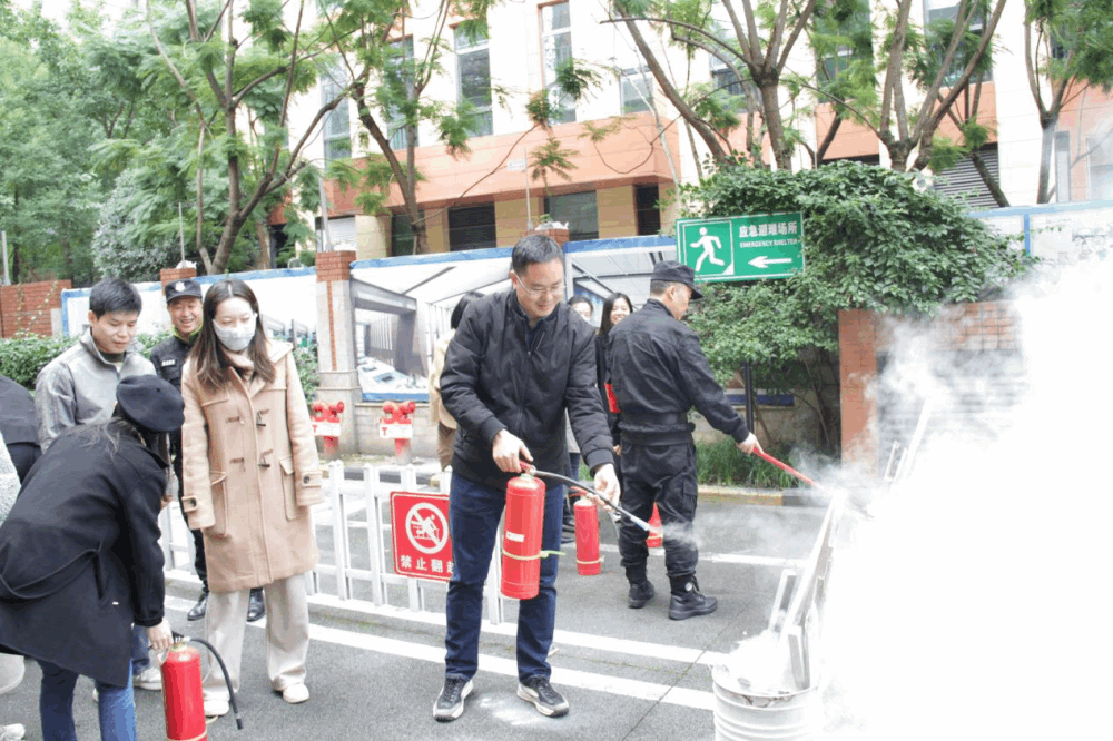 2023年11月13日星期一早上九点,美术组老师在物业公司的带领下学习如何使用灭火器,学习在火情中如何应变;物业公司安保人员为我们讲解了三种基本的灭火器,分别是水基灭火器、干粉灭火器,二氧化碳灭火器。我们使用的干粉灭火器没有办法将火源完全扑灭,极其容易复燃。如果火情发生在汽车上可以使用二氧化碳灭火器进行灭火。