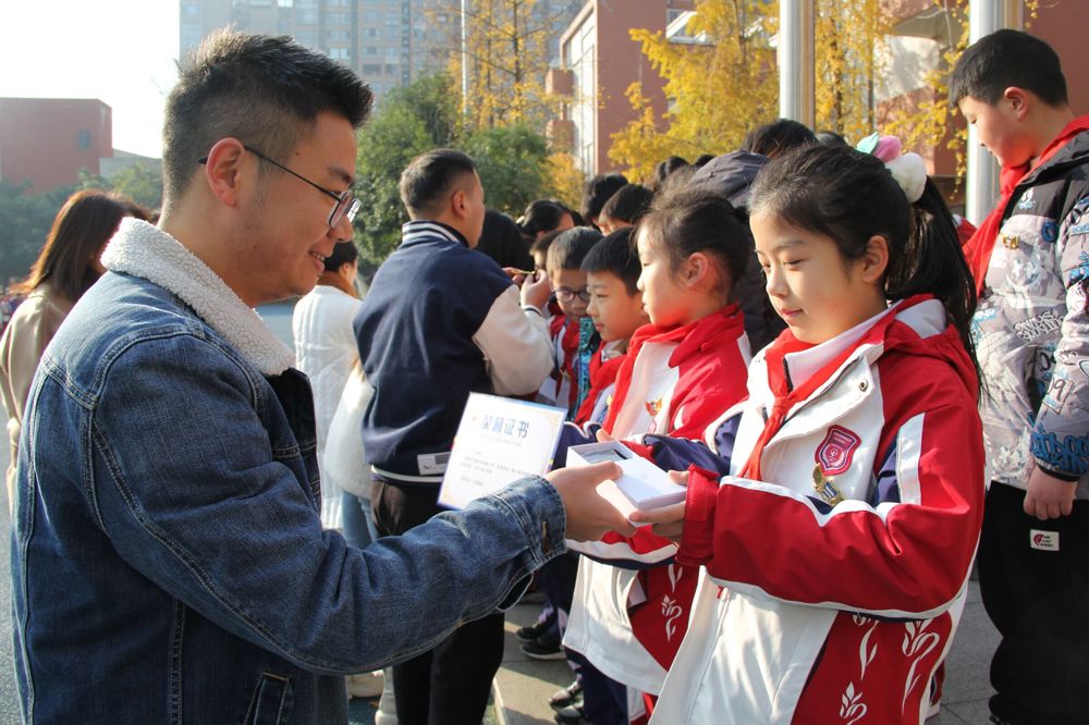 “青少年科学院小院士”称号的同学颁发聘书并进行授牌仪式。接着,曹校长和姚校长为本学年在各类科创活动中获奖的孩子颁发了奖状。在紧张激烈的比赛中,小泡泡们体现出了不畏艰辛、迎难而上、团结合作的精神,同时也收获了成功的喜悦。