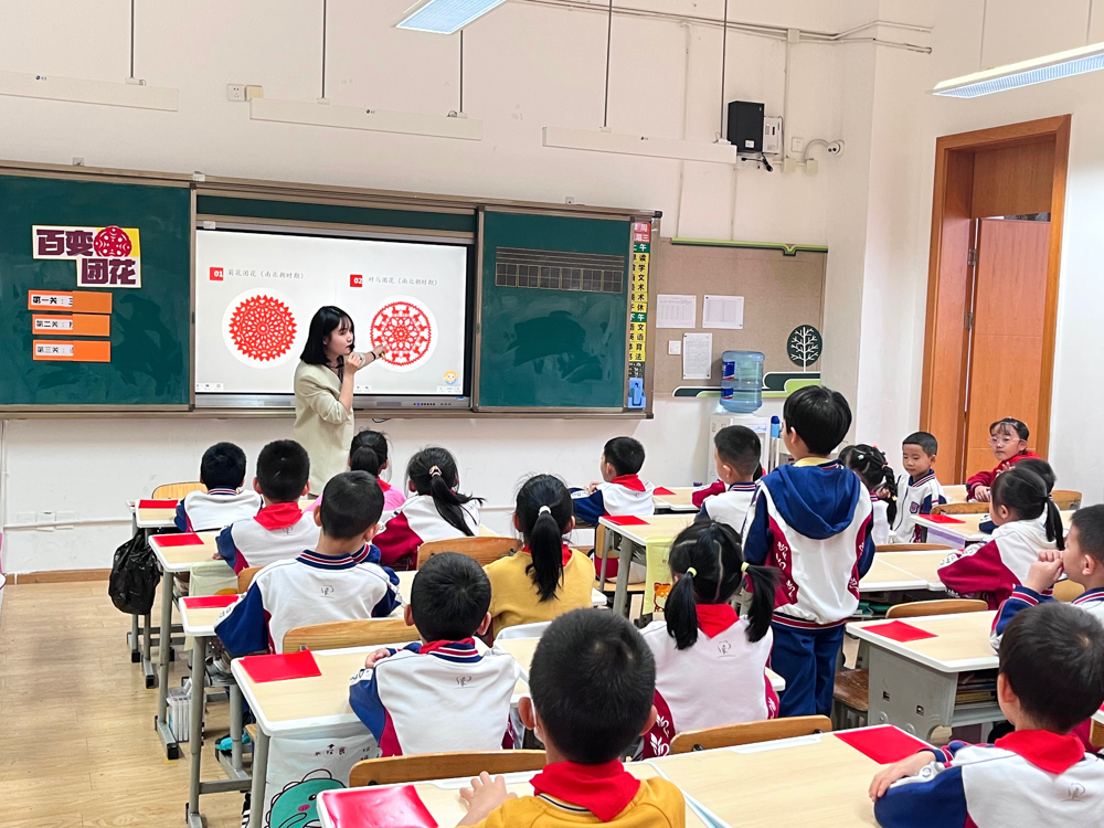 梁老师以《百变团花》为题,引导学生自主观察团花的纹样特点,让孩子们发现它们都是重复的对称图案,从而让学生自己想出第一步“折”法。通过引导启发、探究学习、大胆创作、展示评价、课堂总结等环节加深对团花的认识了解、纹样学习和动手设计能力,从而设计出漂亮的团花。在感受剪纸文化的美感中,感悟丰富的剪纸艺术语言,提高学生对剪纸学习的热情与兴趣,在剪团花的过程中培养学生耐心、认真的学习态度。