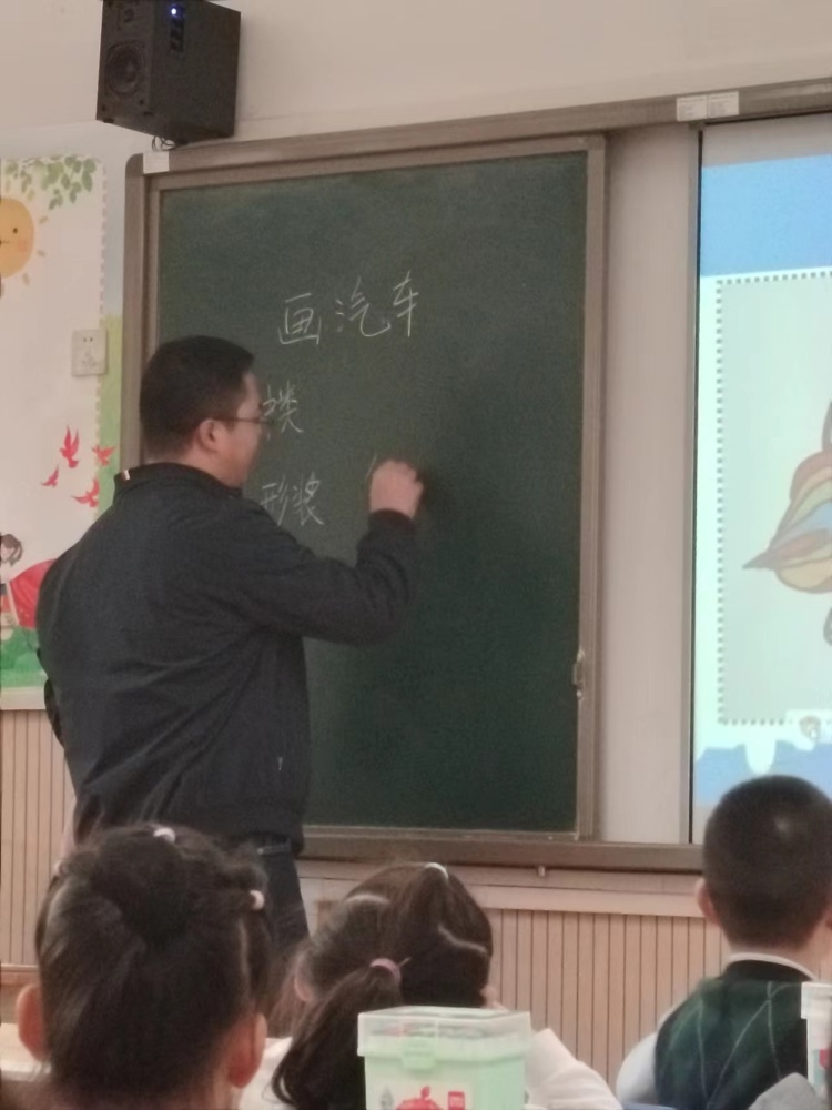 李世涛老师以《画汽车》为主题,通过观察、讨论,分析汽车外形特点,引导学生用几何图形分析、概括汽车的外形,达到层层递进的目的。在示范环节,李老师带领学生解决画面大小的,图形概括,细节装饰、色彩装扮等环节,并进一步引导学生进行个性化装饰,强化基础要求,突出阶段目标,达到教学目的。