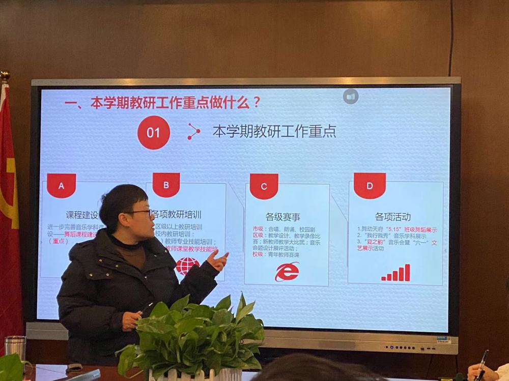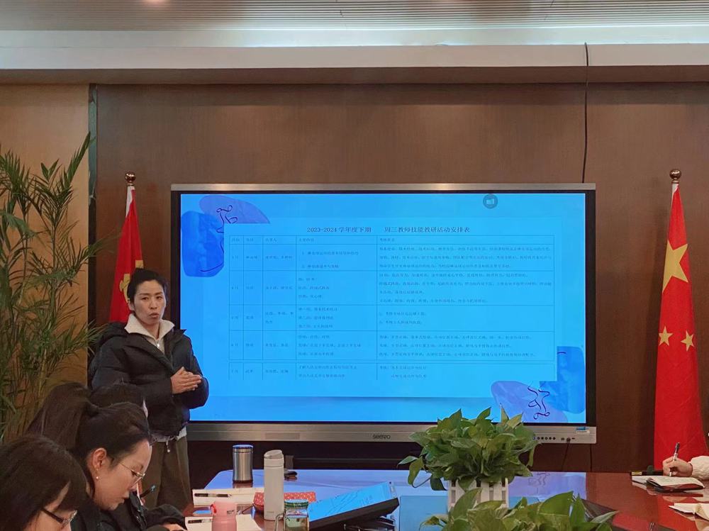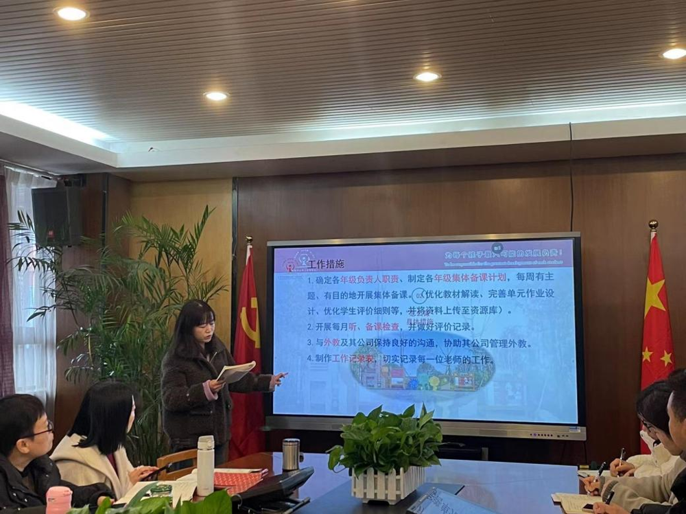 英语学科备课组长姚瑶老师围绕英语学科学期重点工作和具体实施分享了英语学科教研培工作计划,工作安排详实,分工明确。