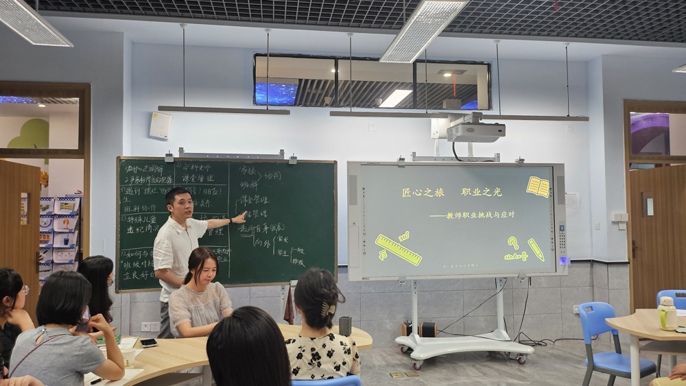 培训中,赵靖主任采用分享式的教学方法,结合自身丰富的教学经验,深入剖析了新教师可能遇到的各种职业挑战。各小组教师头脑风暴,将职业挑战归类为班科和家校协同,课堂和学生管理以及教师发展。新教师要迅速适应角色转变,从学生到教师,不仅要有扎实的专业知识,更要具备良好的沟通能力和课堂管理能力。同时,赵主任强调了坚持学习的重要性,鼓励新教师不断更新教育理念,掌握新的教学技术,以适应时代的发展。