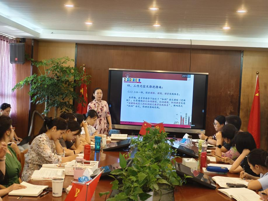 语文组罗萍老师分享语文组教研计划,提出本学期将落实以下工作内容及措施:三位一体,探索课程、课题、课堂实践体系;聚焦学科精品活动,亮出语文学科特色;教研协同,助力教师专业成长;聚焦队伍建设,升华内驱力、撬动发展力、加速成长力,锻造核心竞争力,助力教师专业化发展。