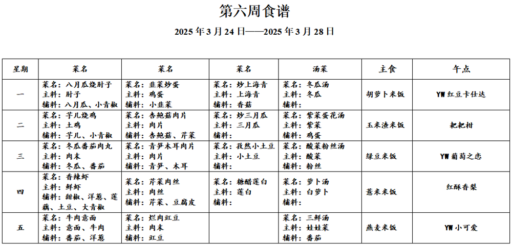 请各位家长查看第六周午餐菜谱,若您的孩子对某样食材过敏,请一定要提前告知班主任老师哟,谢谢!
