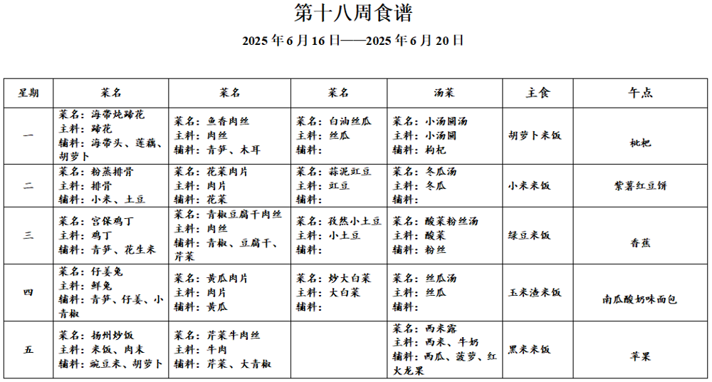 请各位家长查看第十八周午餐菜谱,若您的孩子对某样食材过敏,请一定要提前告知班主任老师哟,谢谢!