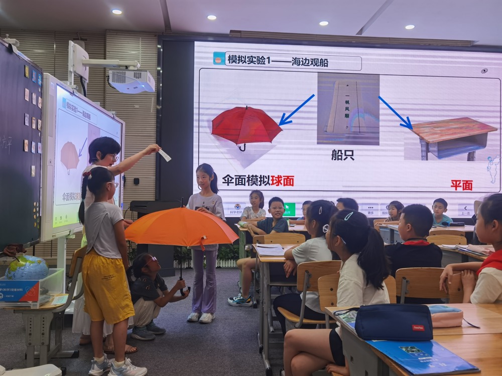 6月11日,我校科创组骨干教师程老师为三年级学生带来了一堂富有思辨精神的科学课《地球的形状》。程老师巧妙运用两个经典的模拟实验:首先借助伞面帮助学生探究“海边观船”的实验现象,学生通过对比平面上观船的现象,明白地球不是平的;接着借助“月食”现象模拟不同形状地球在月球上投射的阴影,一起为地球的球体形状寻找关键证据。在孩子们激烈的讨论声中,程老师告诉大家亚里士多德距今2000多年,人类认识地球形状的过程漫长而曲折,其中99%的时间都停留在想象和推测的阶段,直到人类飞入太空,亲眼目睹了地球的形状,希望孩子们要敢于探索、勇于求证、不断进步。