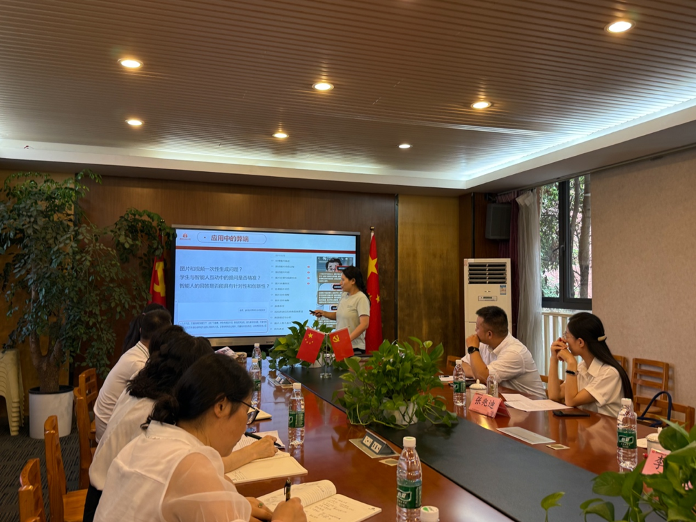 学科组长与骨干教师代表秦小青、涂悦、胡嘉辰老师分享了 AI 在教学中的初步应用。教师们提到,在备课环节尝试使用智能工具优化设计、生成课件,在课堂互动中引入技术手段辅助教学,并探索跨学科融合创新。这些实践既展现了技术赋能的价值,也提出了工具适配性、教学融合度等现实问题,为课题研究提供了一线视角的参考。