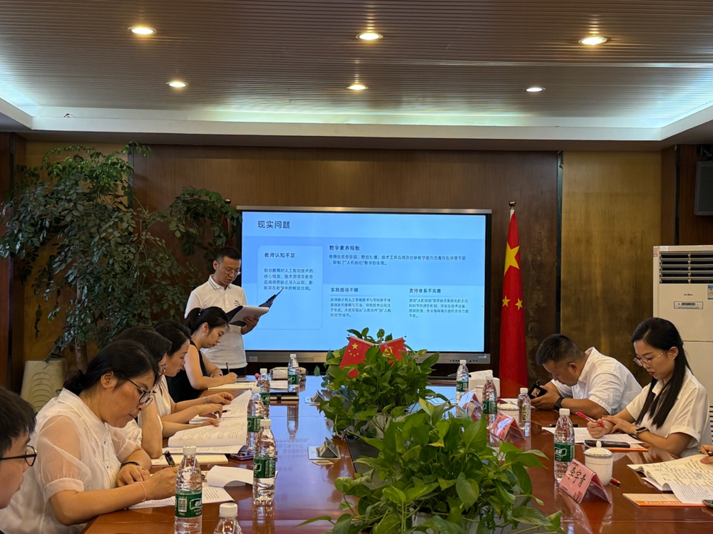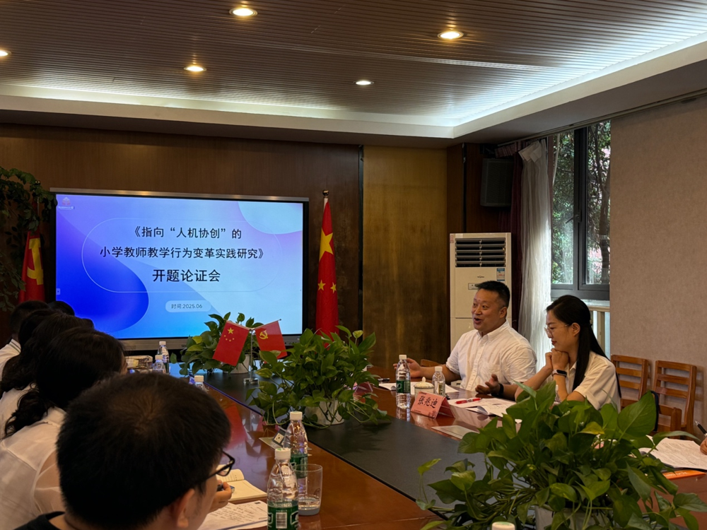 7 月1日,成都市泡桐树小学天府校区举行《指向 "人机协创" 的小学教师教学行为变革实践研究》开题论证会。成都信息工程大学副校长舒红平、成都市教育科学院信息科研教研员张兆迪、成都高新区教育发展中心科研管理教研员李宇青等专家,以及学校课题组成员、骨干教师代表参会,共同探讨人工智能时代的教学变革路径。