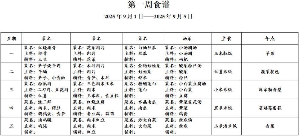 请各位家长查看第一周午餐菜谱,若您的孩子对某样食材过敏,请一定要提前告知班主任老师哟,谢谢!