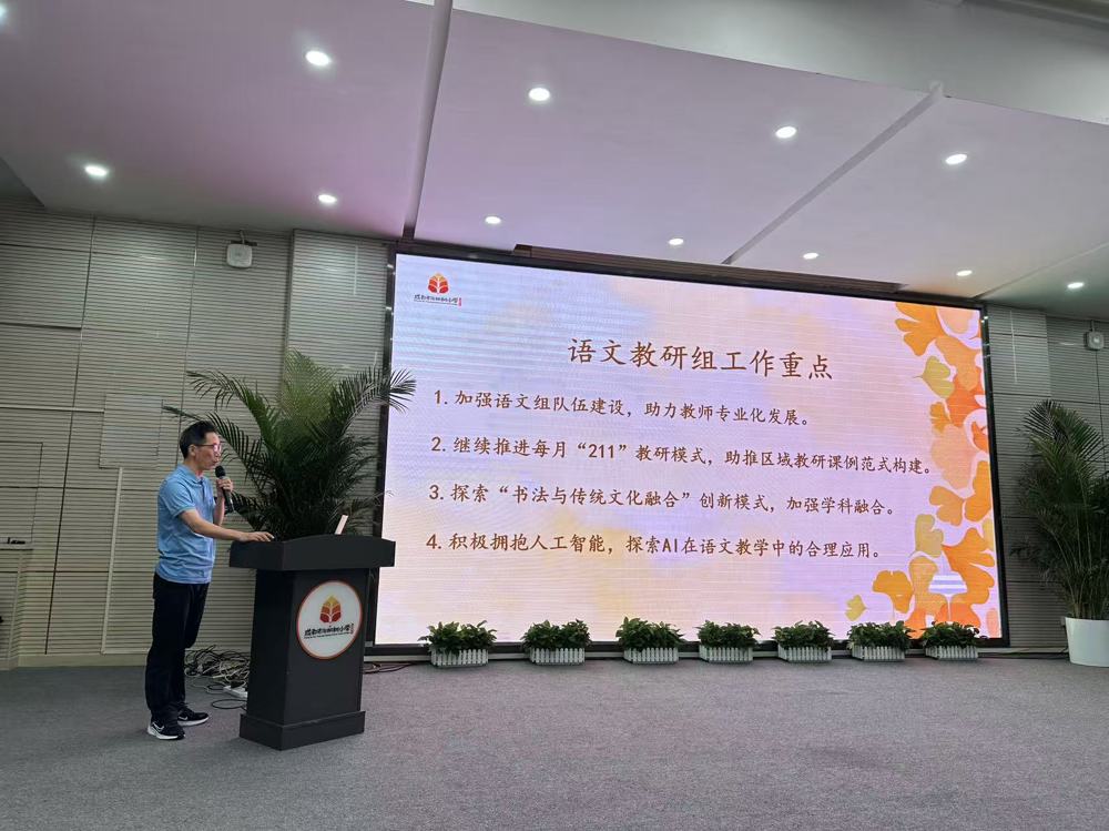 活动在温馨而专业的氛围中拉开帷幕。学科组长张大健老师首先代表语文组分享了本学期教研培的总体计划。他强调,本学期将继续聚焦“双减”与“双新”的落实,以课程引领教学方向,以课题推动实践探索,以教研促进教师成长。重点工作包括加强教师队伍建设、推进“211”教研模式(每月两次集体备课、一次大组教研、一次工作坊)、探索书法与传统文化融合、积极应用人工智能辅助语文教学等。