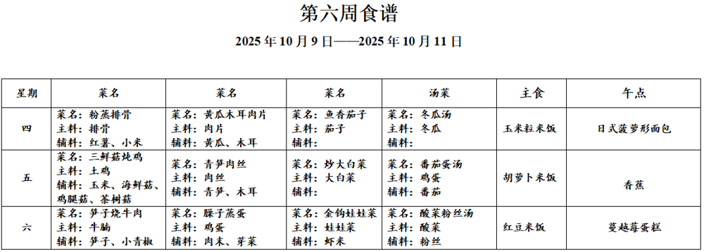 请各位家长查看第六周午餐菜谱,若您的孩子对某样食材过敏,请一定要提前告知班主任老师哟,谢谢!