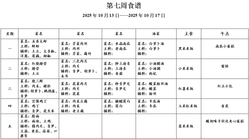 请各位家长查看第七周午餐菜谱,若您的孩子对某样食材过敏,请一定要提前告知班主任老师哟,谢谢!