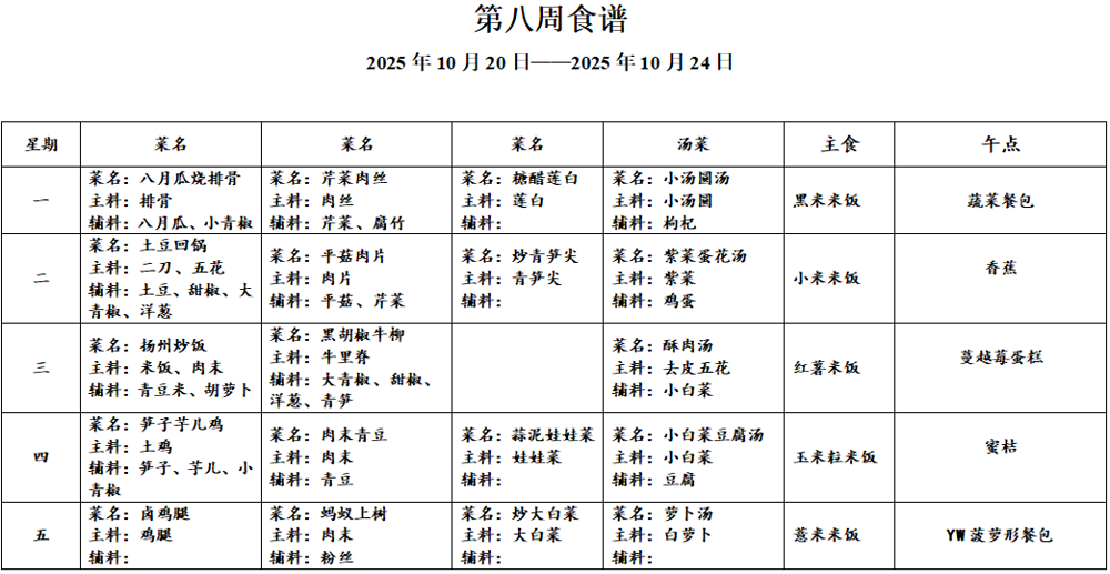请各位家长查看第八周午餐菜谱,若您的孩子对某样食材过敏,请一定要提前告知班主任老师哟,谢谢!