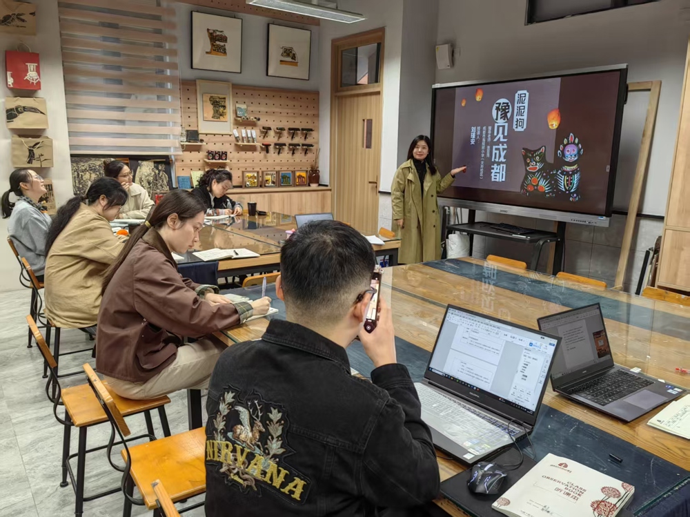 刘瑾安老师在《泥泥狗豫见成都》一课中,组织了一场跨地域的文化对话。学生通过平板电脑搜索河南“泥泥狗”的特征资料,运用AI口令生成创作灵感,将这一传统泥塑形式与成都的熊猫文化相结合,最后动手创作出独具特色的黏土作品。