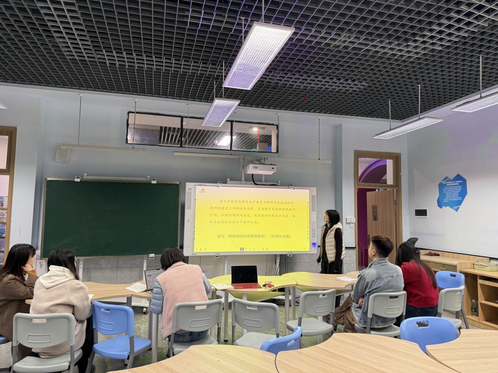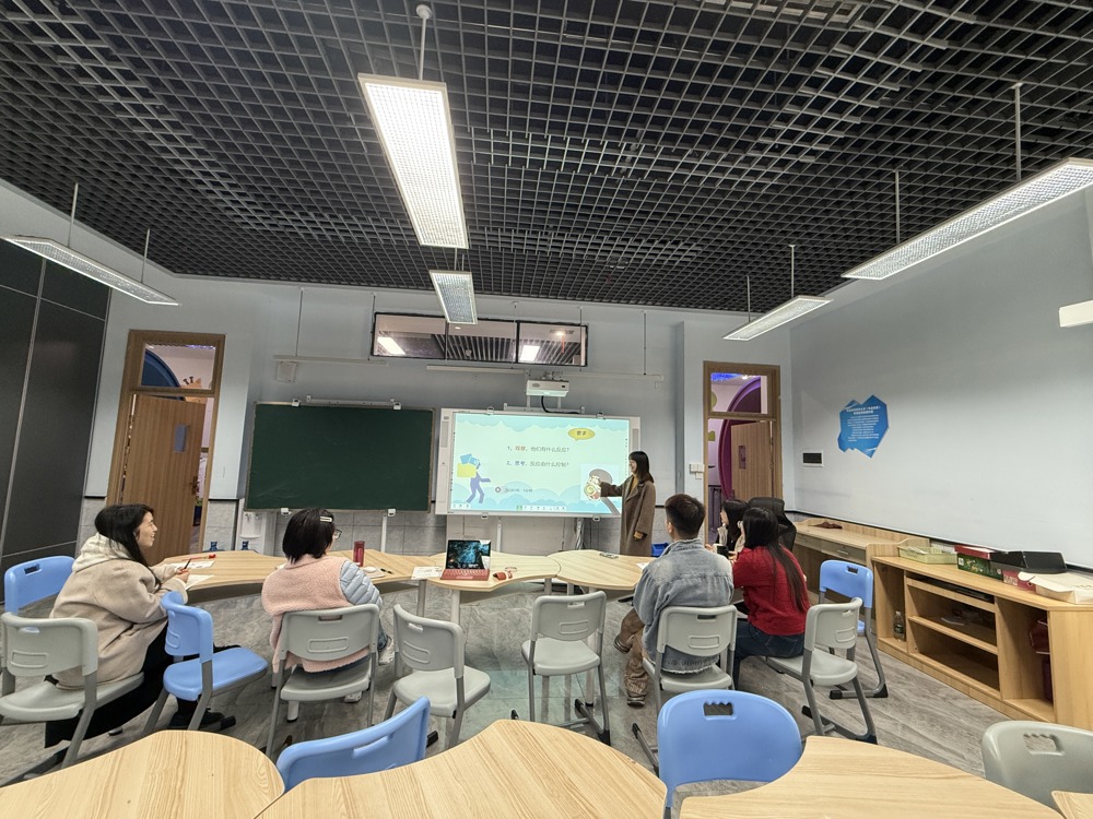 活动伊始,教师集体学习《师德师风失范典型案例 - 惩戒失当篇》,通过案例研读与交流,强化师德意识,明确教育教学行为规范。随后,邓皓峰、何思蓓、周云露三位青年教师分别以《家里的物品》《身体的 “联络员”》《设计建造塔台》为课题,进行说课。三位青年教师结合应用VR场景模拟,AI生图,AI智能体,电子班牌评价,反馈器等技术赋能课堂,阐述教学思路与学生科学思维培养路径。全体教师聚焦 “数字赋能” 展开研讨,点评说课亮点并提出改进建议。最后,教师集体学习科技教育课程资料,更新教育理念。?