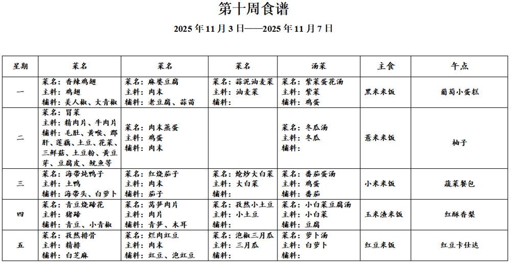 请各位家长查看第十周午餐菜谱,若您的孩子对某样食材过敏,请一定要提前告知班主任老师哟,谢谢!